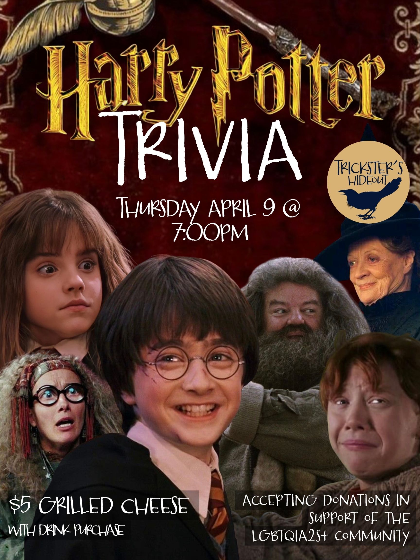Join us for a magical evening of Harry Potter trivia at Trickster’s Hideout! Doors at 6 PM, with the main trivia kicking off at 7 PM.